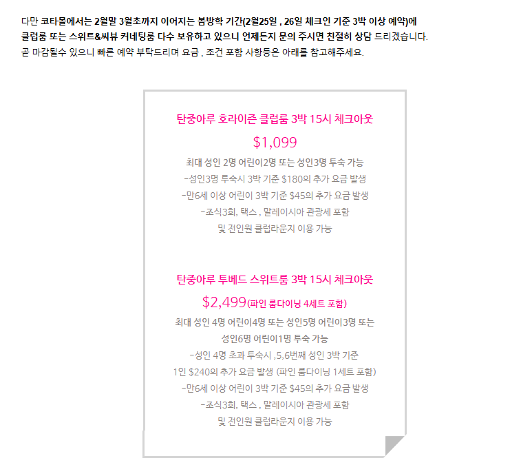 2026년 2,3월 샹그릴라 탄중아루 리조트 객실 현황 - 코타키나발루 여행 ( 마지막 주 봄 방학 기간 객실 다수 보유) 페이지 정보 작성자 쪽지보내기 메일보내기 자기소개 아이디로 검색 전체게시물 쪽지보내기 메일보내기 자기소개 아이디로 검색 전체게시물 작성일26-01-31 14:21 조회3회 댓글0건 관련링크 https://blog.naver.com/kotajigi/224165511409 0회 연결 다음글 목록 본문 https://blog.naver.com/kotajigi/224165511409 (관련 포스팅) 댓글목록 등록된 댓글이 없습니다. 다음글 목록
